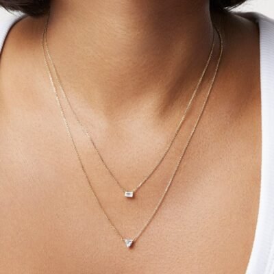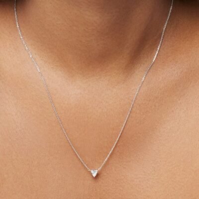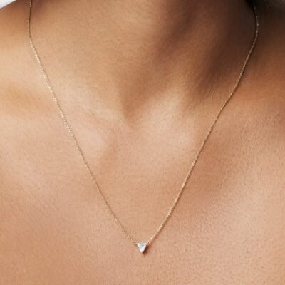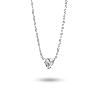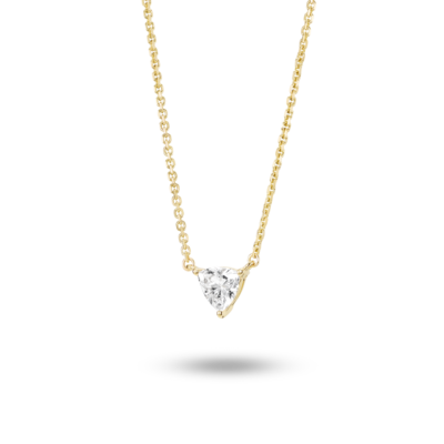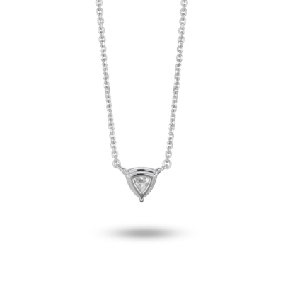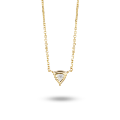 Available in 14k white or yellow gold, this minimalistic trillion pendant will compliment any outfit whether worn solo or layered with other necklaces. The ¼ carat stone is graded at VS+ clarity, Very Good cut, Near Colorless and proudly grown from 100% renewable energy at our lab in Portland, Oregon.